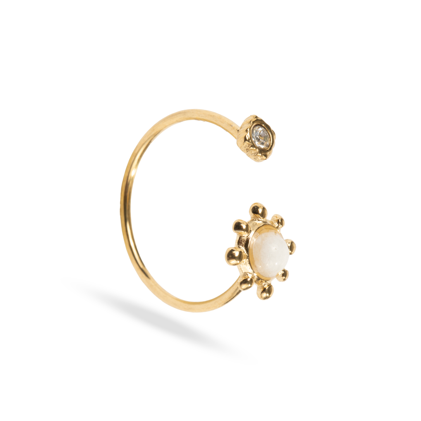 Este diseño combina dos detalles en un solo anillo abierto: una pequeña piedra brillante y una piedra blanca central rodeada de delicados puntos dorados. Es una pieza femenina y versátil que aporta un toque romántico a cualquier look.