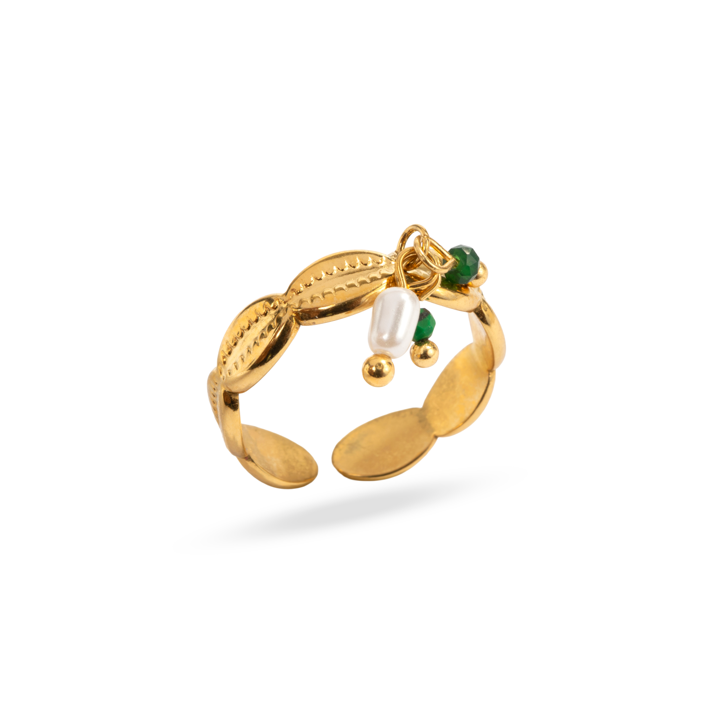 Un diseño romántico y delicado que combina una perla central con pequeños dijes verdes que aportan movimiento y frescura. Su forma abierta lo hace cómodo y versátil, ideal para quienes aman piezas con detalles sutiles pero especiales.