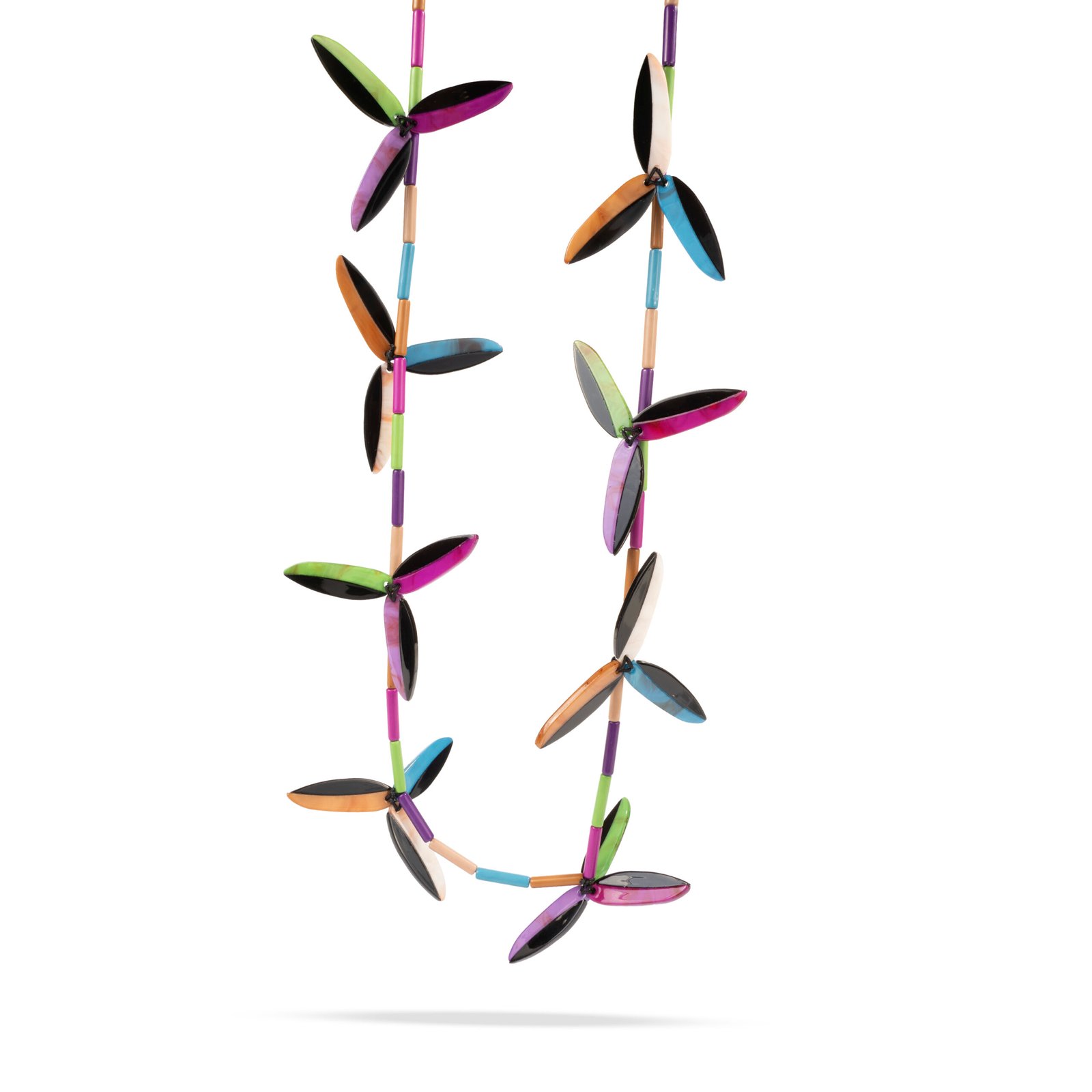 Collar largo elaborado en resina multicolor con diseño inspirado en formas orgánicas tipo pétalo. Sus piezas estilizadas y alargadas crean una composición dinámica y moderna, combinando tonos vibrantes y contrastes elegantes. La disposición de las formas aporta movimiento y frescura, convirtiéndolo en un accesorio llamativo pero ligero.
