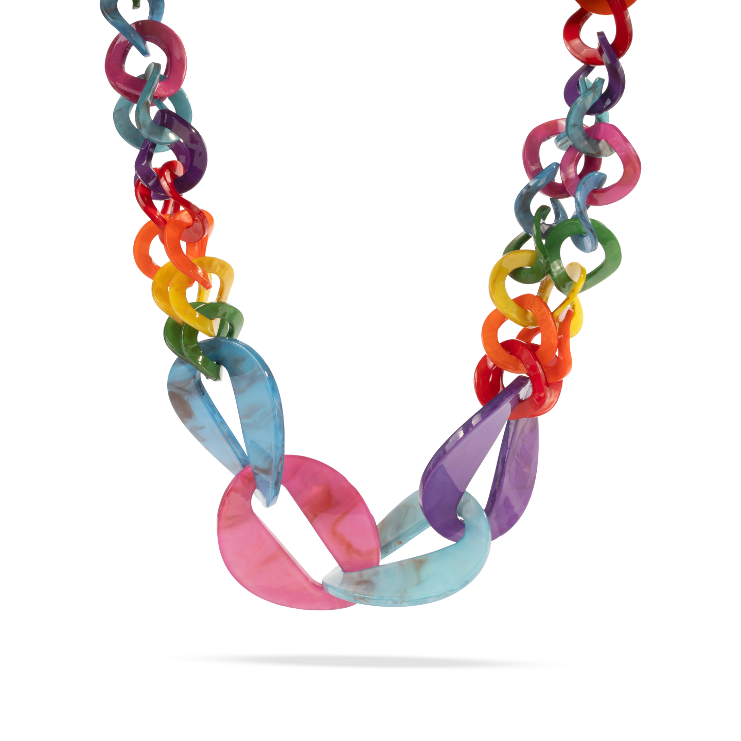 Luce la alegría del color con este collar moderno de resina. Sus eslabones grandes multicolor crean un diseño vibrante y atrevido que transmite energía positiva y creatividad. Ideal para quienes disfrutan destacar con estilo, personalidad y un toque artístico irresistible