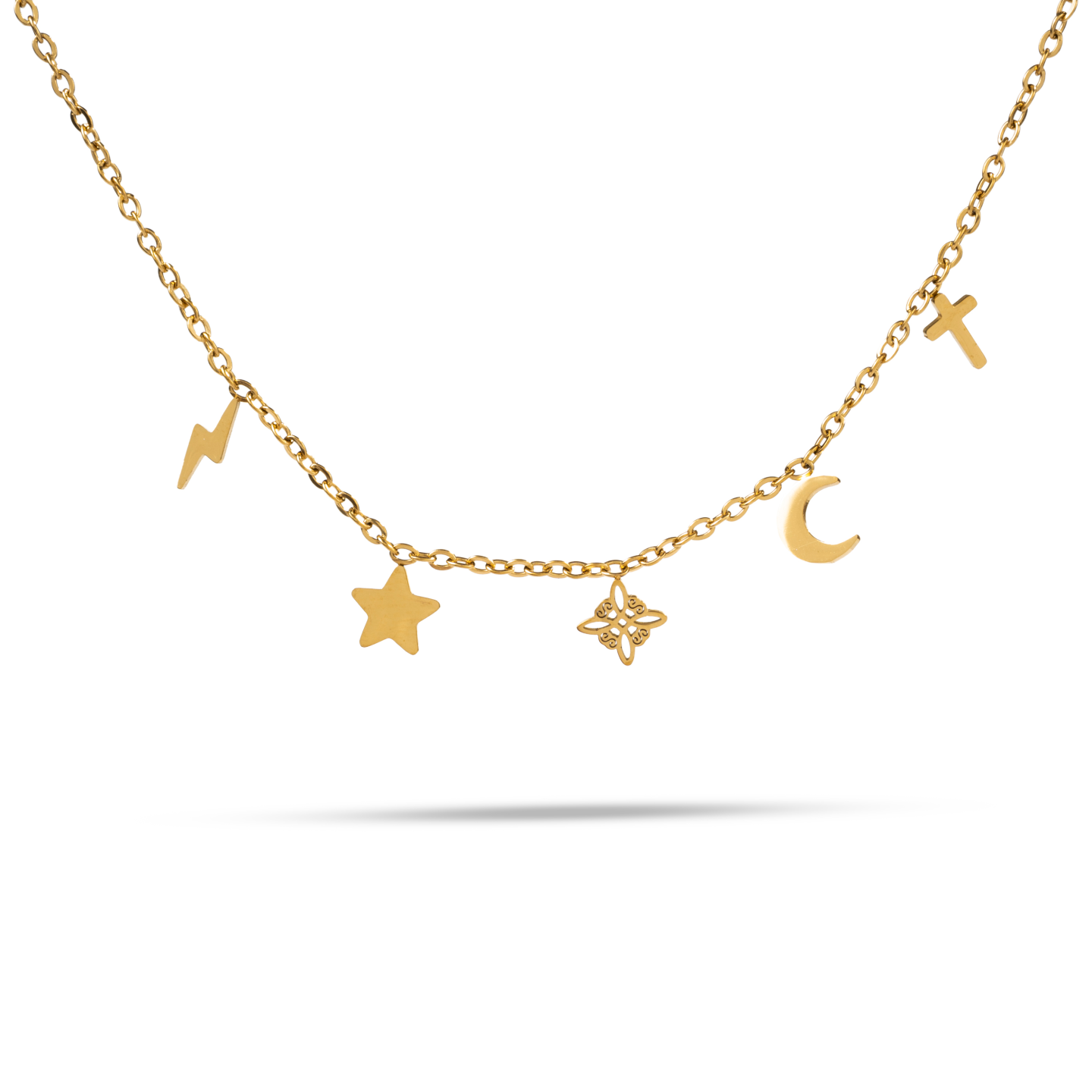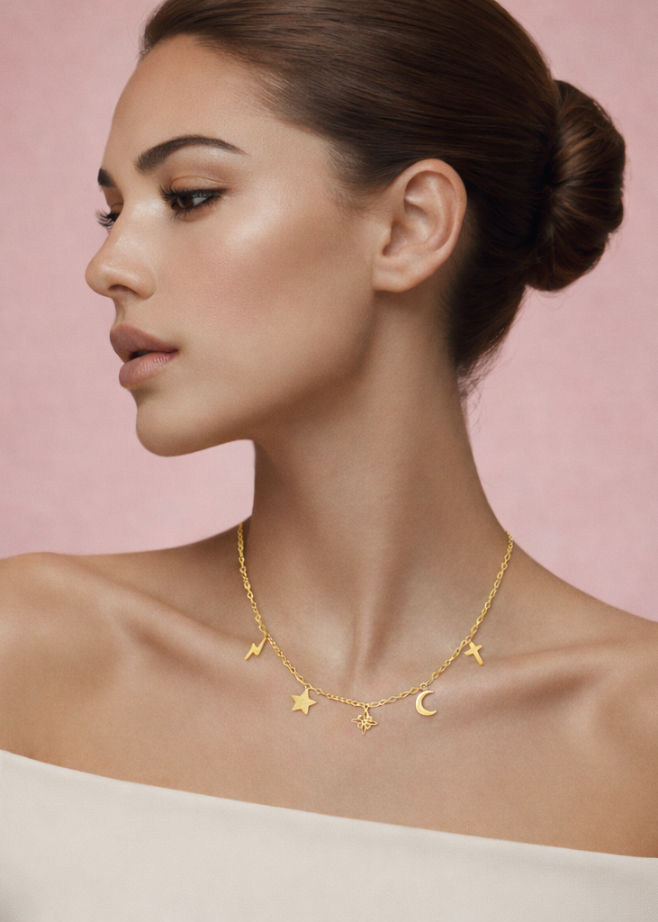 Collar dorado de diseño minimalista con dijes simbólicos que aportan significado y delicadeza. Su fina cadena sostiene pequeños detalles como estrella, luna, rayo y cruz, creando una pieza armoniosa y moderna. Ideal para realzar el cuello con sutileza, es perfecto para uso diario o para combinar con otros collares y lograr un look elegante y actual.