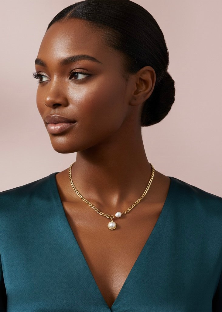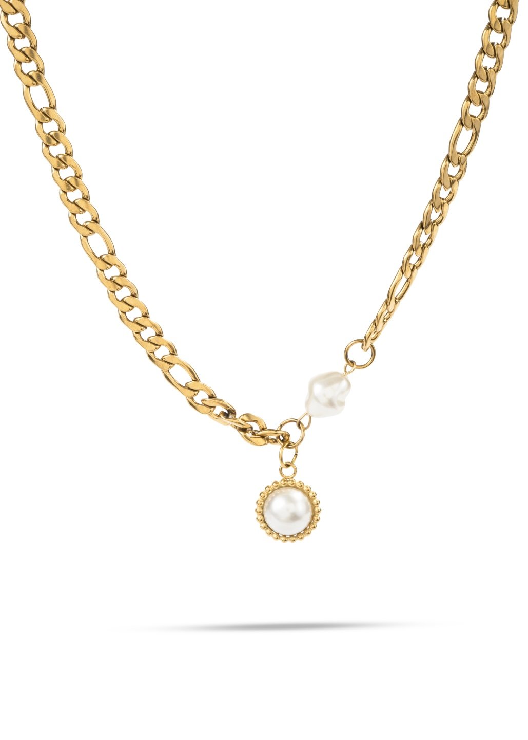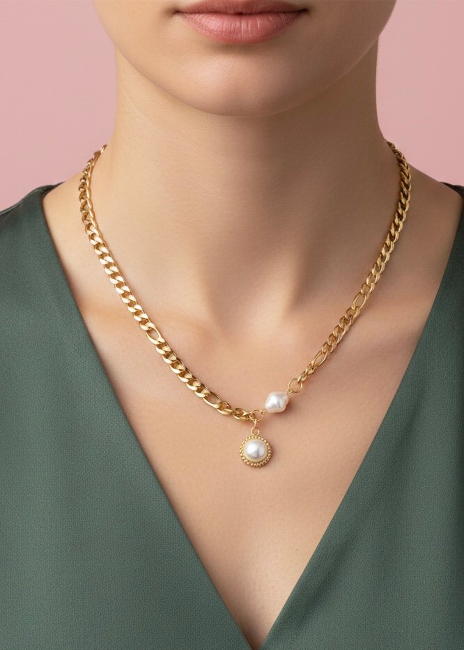 Este collar combina la fuerza de una cadena dorada de eslabones con la delicadeza de las perlas, creando una pieza sofisticada y equilibrada. Su diseño destaca por un charm central con perla enmarcada y un detalle lateral de perla irregular, que aporta un aire orgánico y moderno.