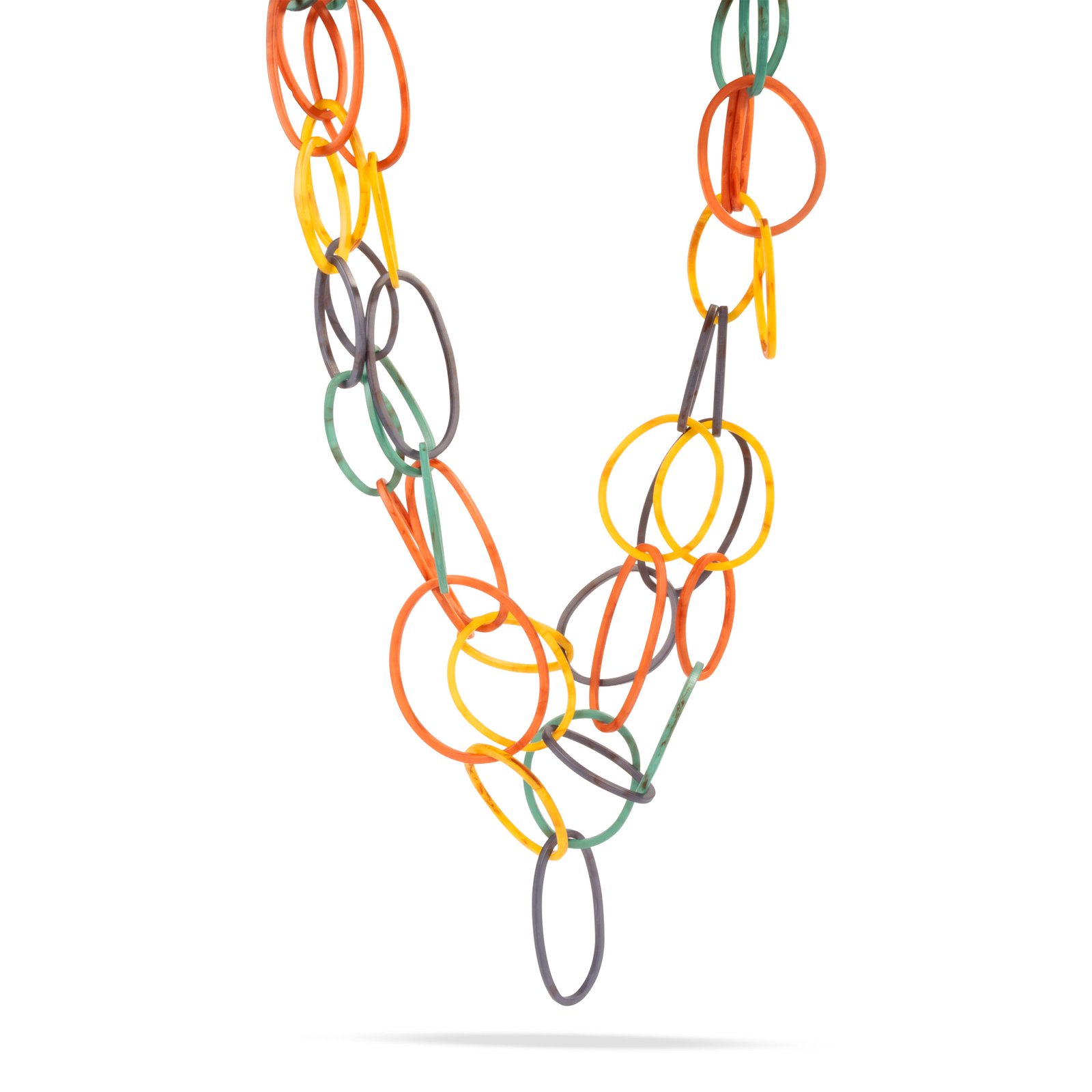 Collar largo de eslabones grandes en tonos multicolor que aporta un toque vibrante, moderno y artístico. Su diseño de aros entrelazados crea una pieza llamativa y ligera, ideal para quienes buscan destacar con un accesorio original y lleno de personalidad. Perfecto para transformar looks neutros en outfits frescos, creativos y contemporáneos.