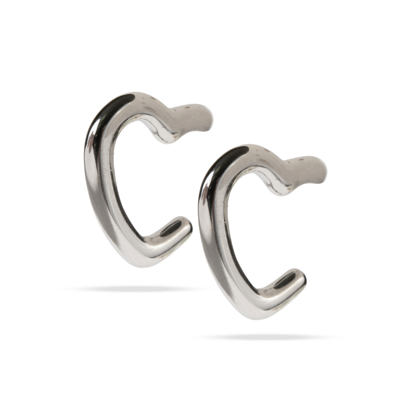 Un corazón plateado de silueta gruesa y acabado espejo. Modernos y con personalidad.