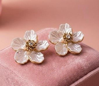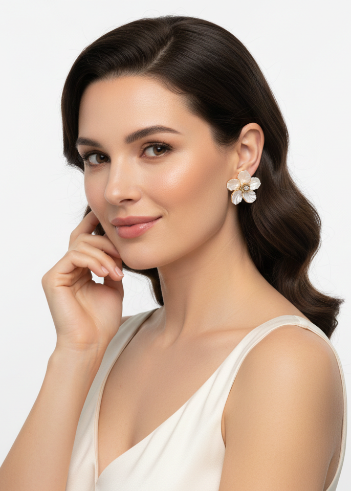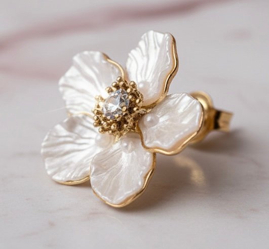 Pendientes delicados y sofisticados inspirados en la belleza natural de las flores. Su diseño floral con acabado nacarado aporta luz y feminidad, mientras que el detalle central brillante añade un toque sutil de elegancia. Una pieza atemporal que realza cualquier look, ideal para ocasiones especiales o para elevar un outfit diario con delicadeza.