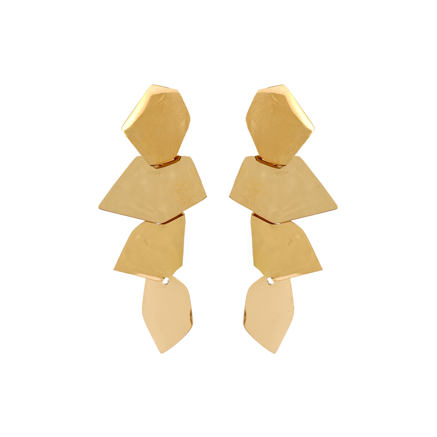 Pendientes largos con formas geométricas irregulares en acabado dorado satinado. Su diseño artístico aporta originalidad y presencia sin perder elegancia.