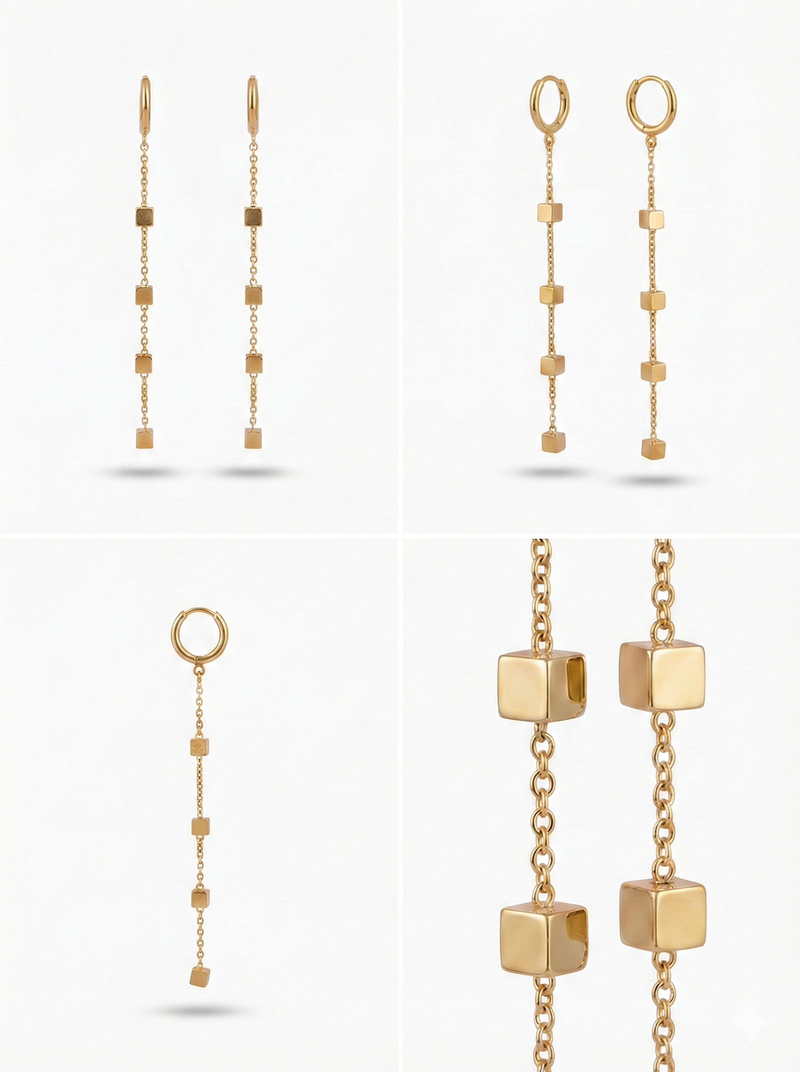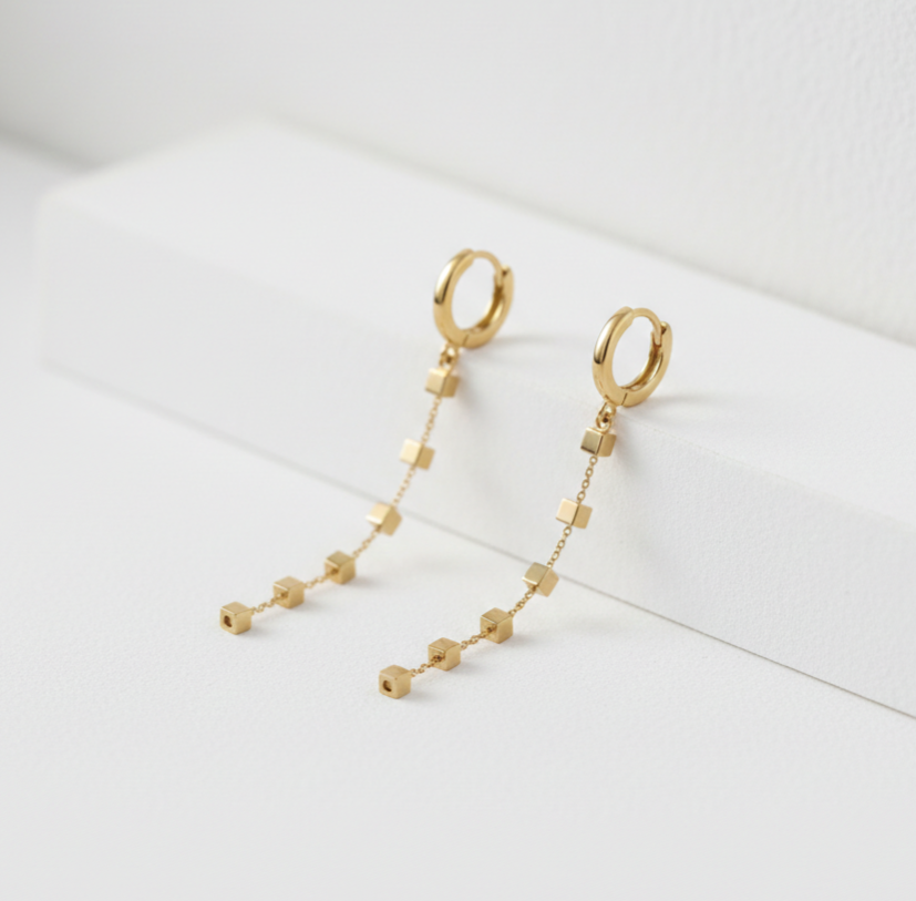 Pendientes sofisticados de líneas limpias y diseño geométrico que aportan movimiento y elegancia al rostro. Su caída delicada y estructura minimalista los convierte en una pieza moderna y refinada, ideal para elevar cualquier look con un toque sutil de brillo. Perfectos para ocasiones especiales o para dar protagonismo a un outfit sencillo.