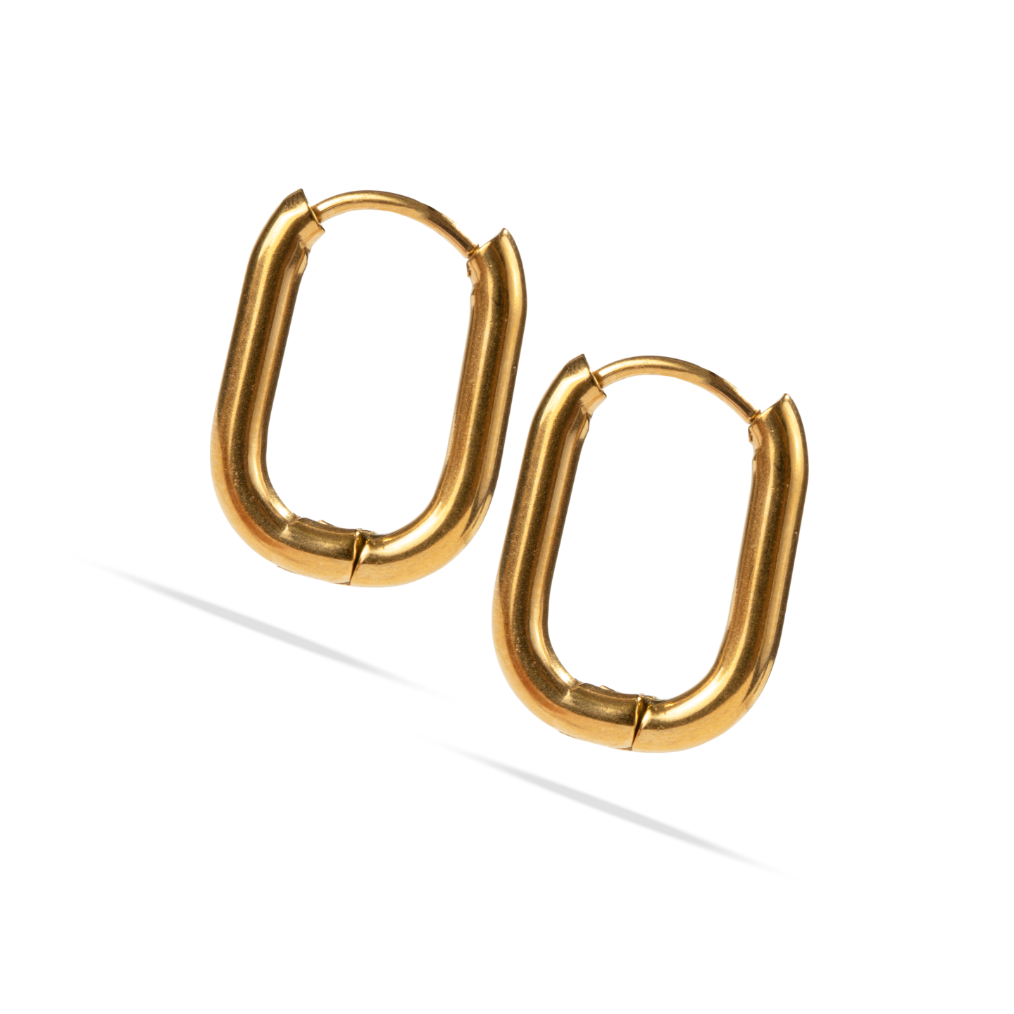 Elegantes y modernos, estos aretes en forma rectangular suavemente redondeada destacan por su diseño minimalista y sofisticado. Su acabado dorado pulido aporta brillo y presencia, convirtiéndolos en el complemento ideal para looks diarios o combinaciones más formales.