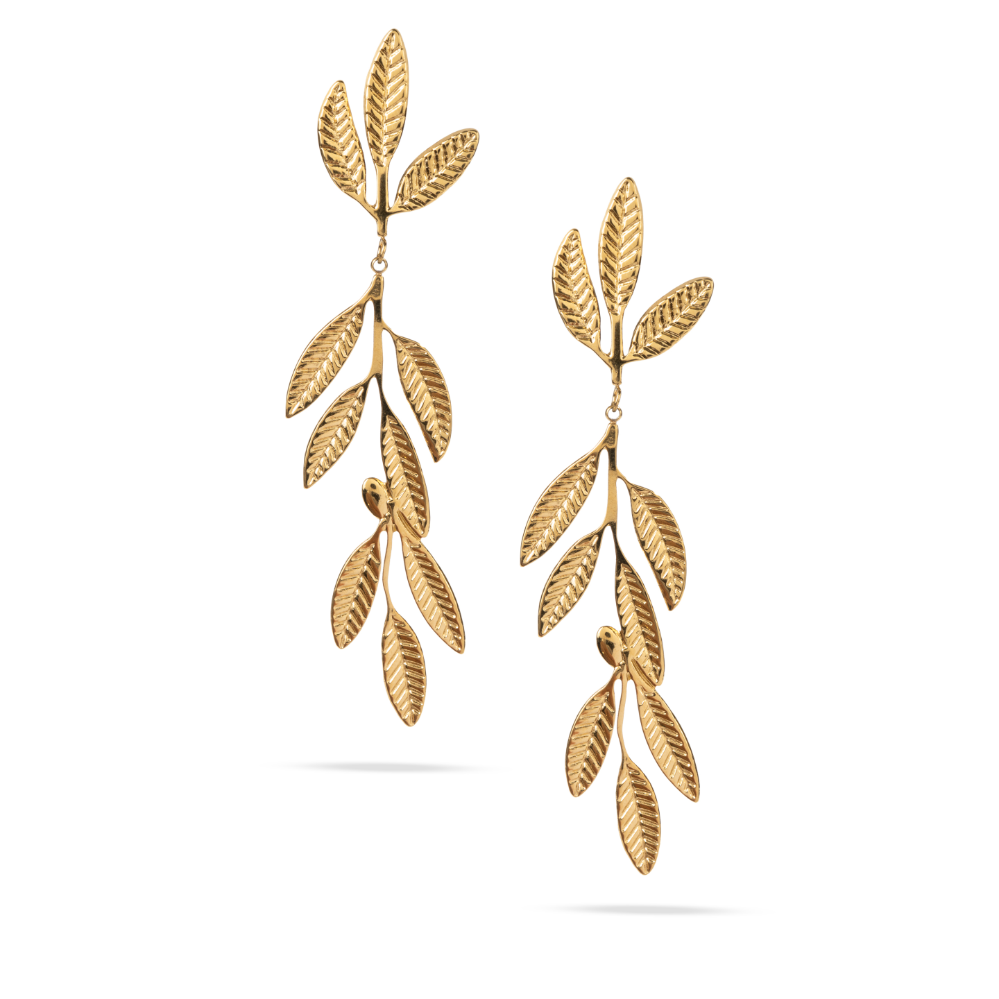 Pendientes largos con múltiples hojas grabadas que aportan textura y profundidad. Su diseño elegante y sofisticado los convierte en una pieza ideal para eventos formales.